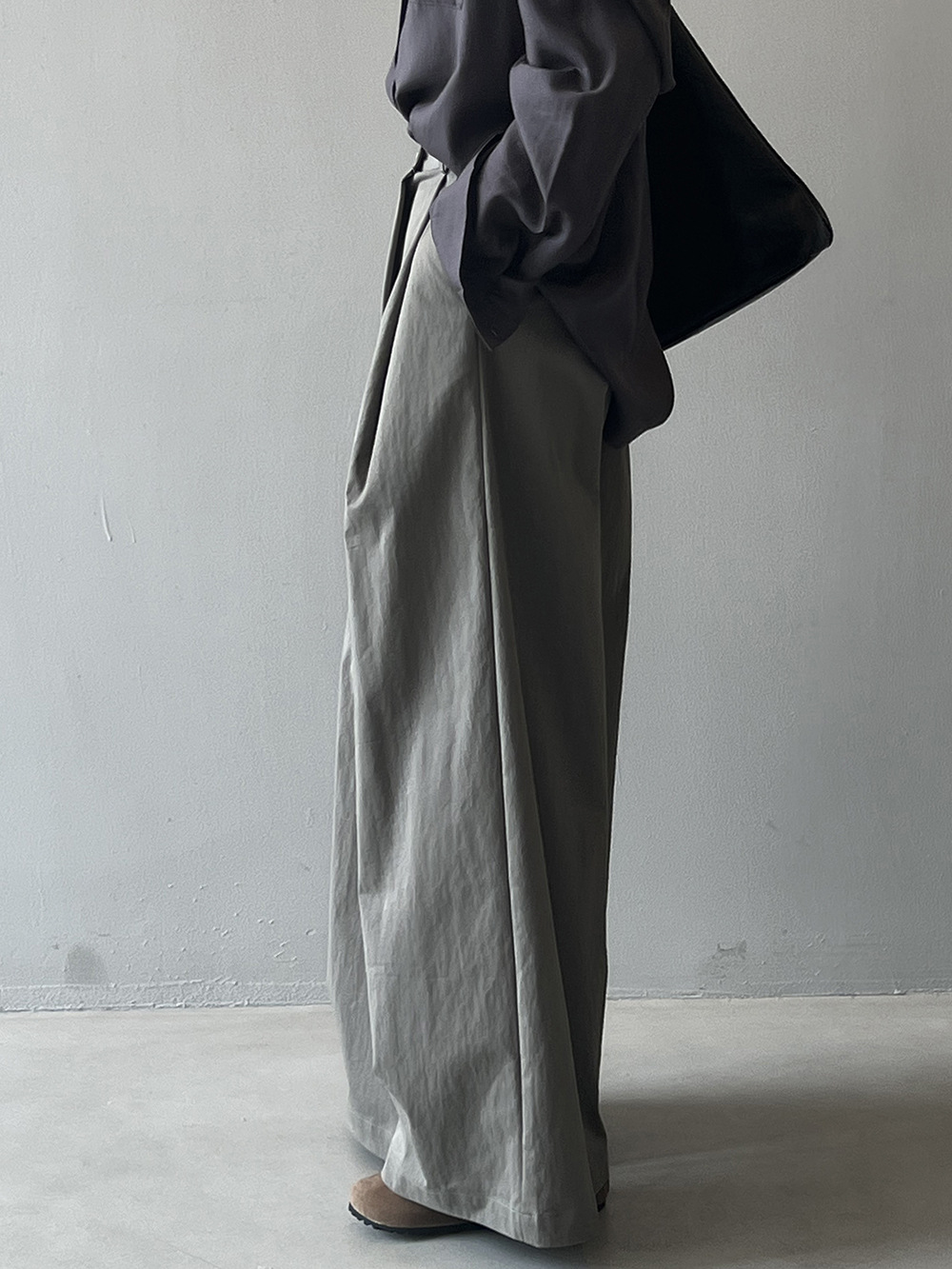 自然なタック加工が施された贅沢な生地感で、まるで風を纏うような軽やかな履き心地を実現しました。