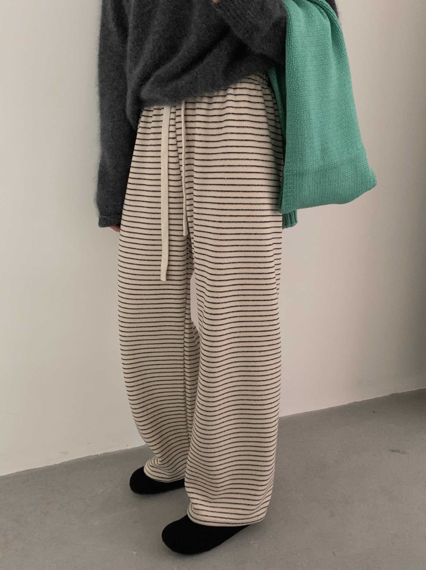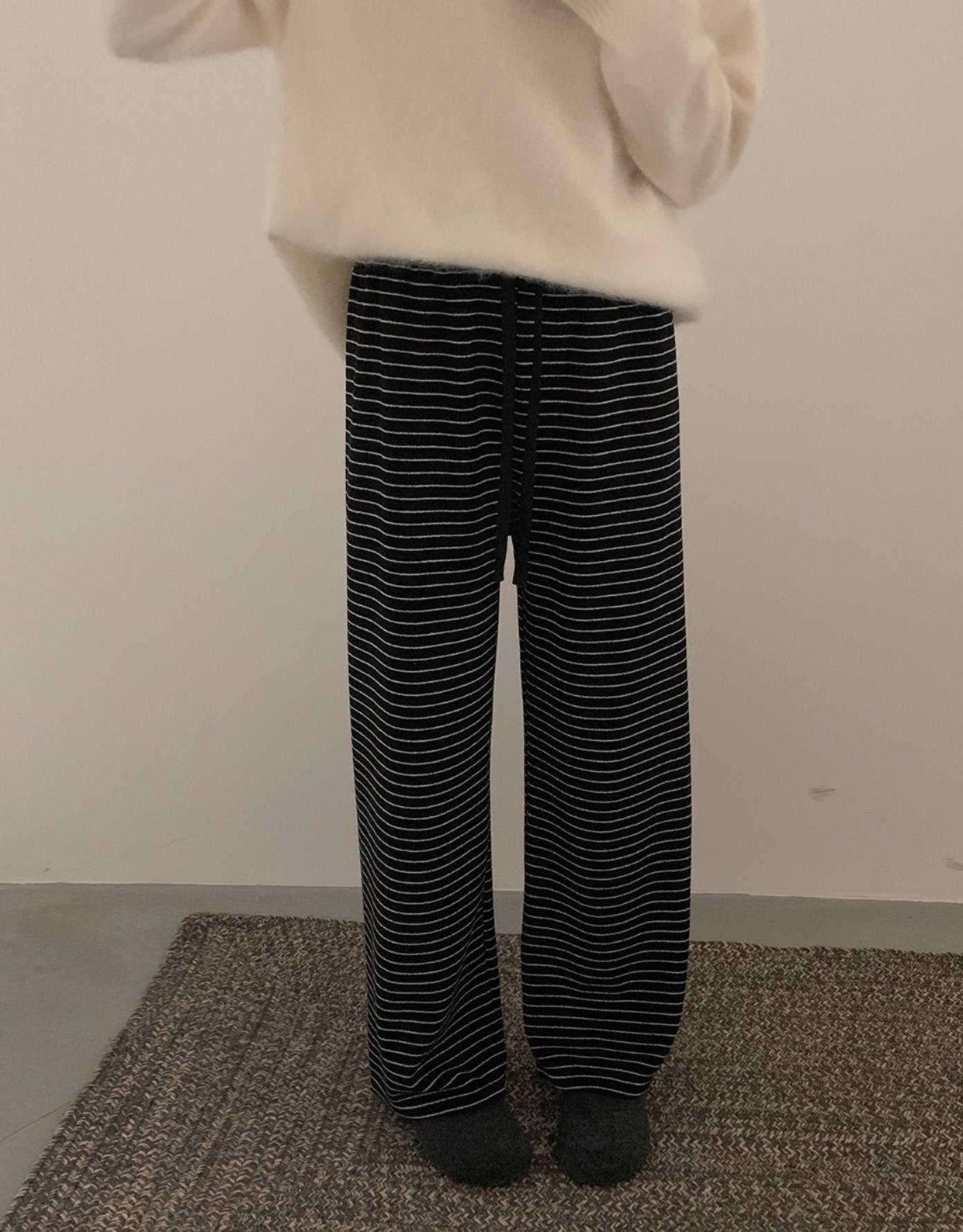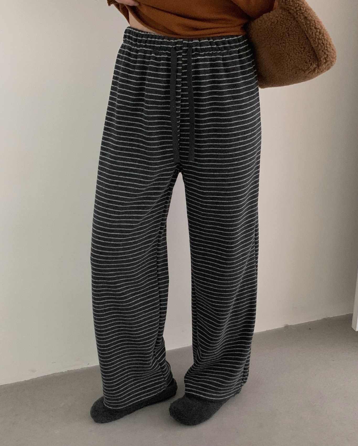 上品なストライプ柄とゆったりとしたワイド設計で、リラックス感と大人の気質を両立。