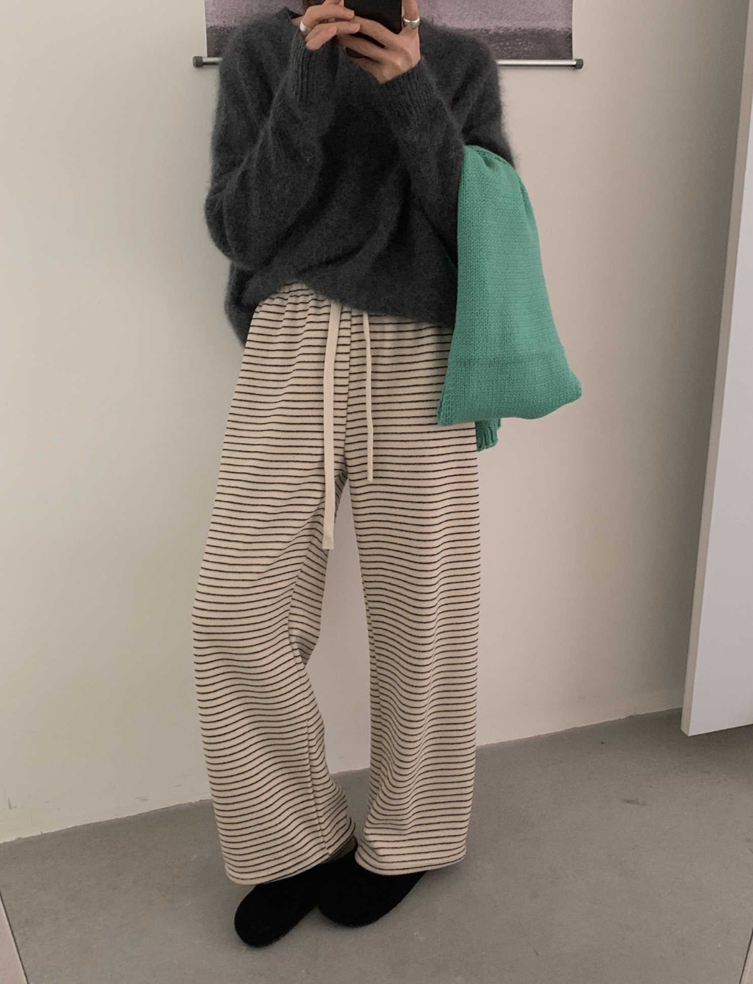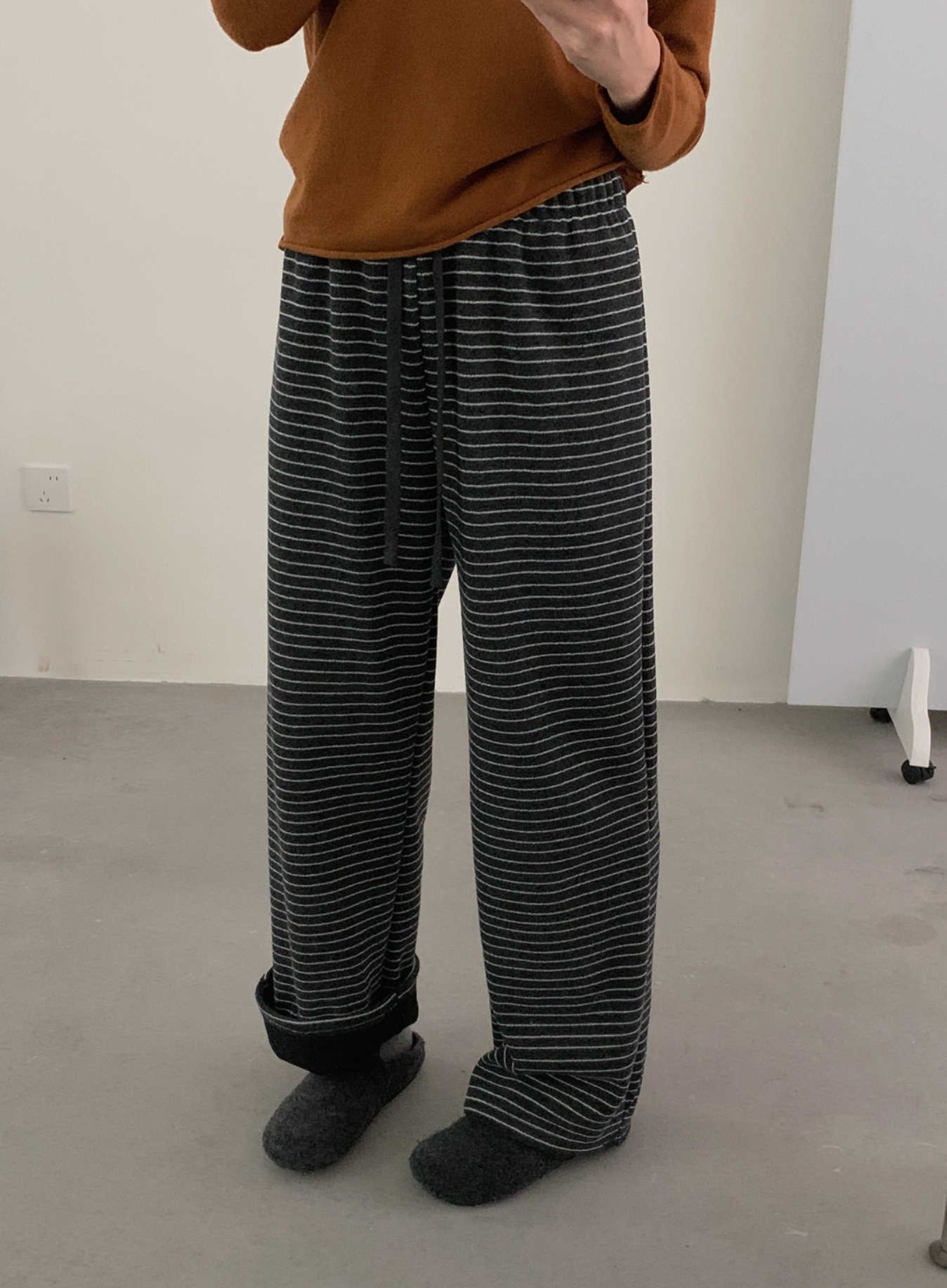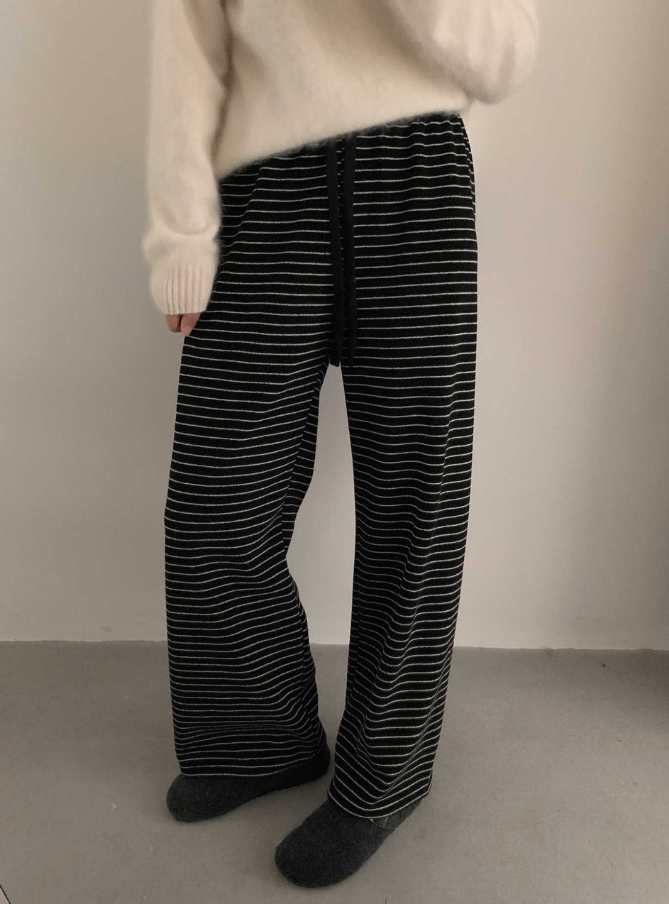 上品なストライプ柄とゆったりとしたワイド設計で、リラックス感と大人の気質を両立。