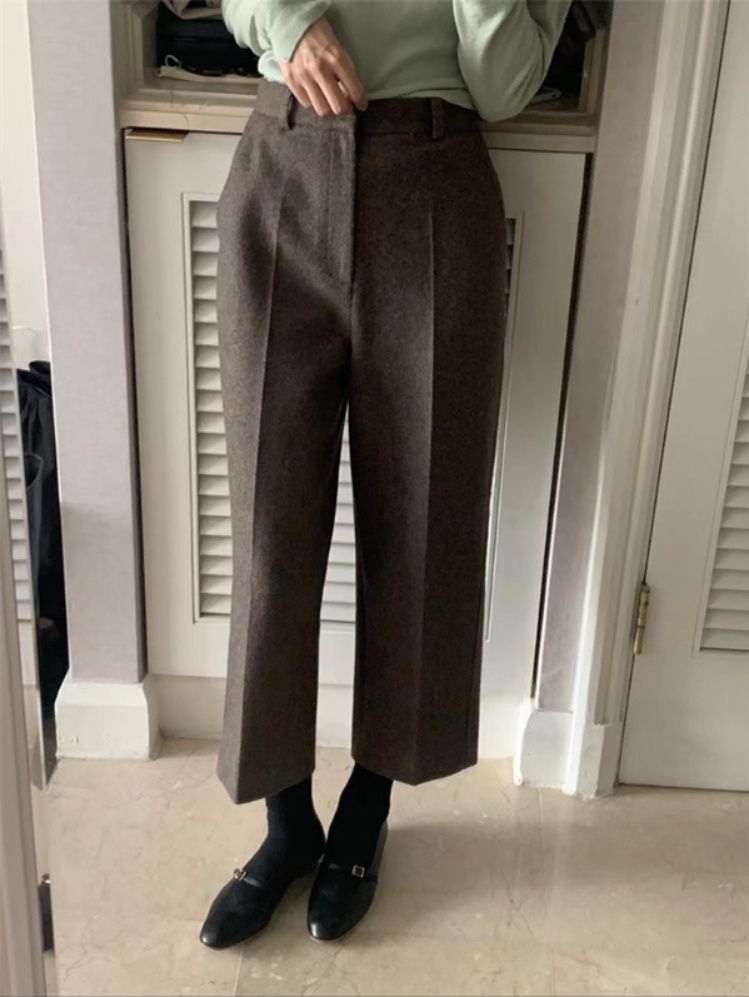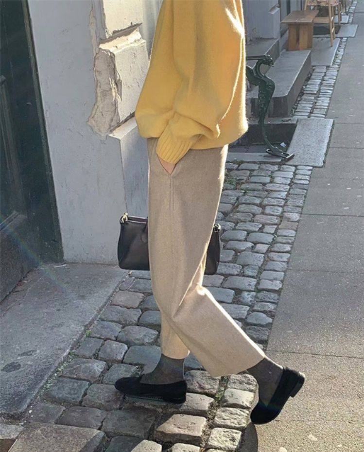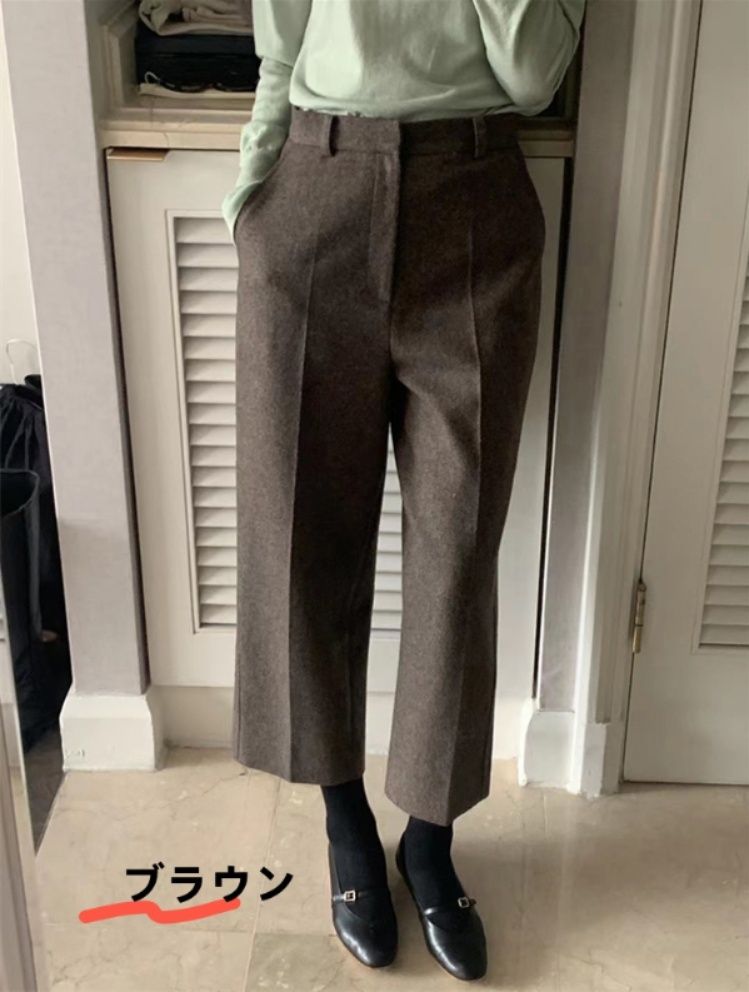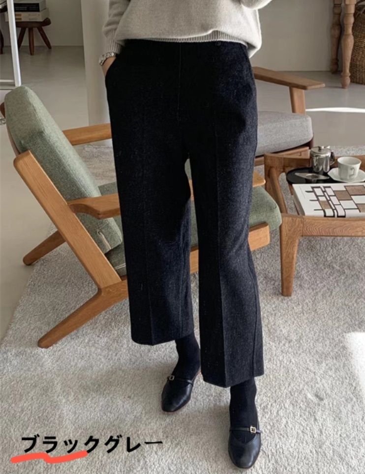9分丈のストレートカットが足元をスッキリ、高ウエストが腰回りを引き締め; ニット生地のふんわり感がシャツやセーターと相性抜群! 痩せ効果UPでおしゃれを楽しみながら体線を引き立たせられるよ
