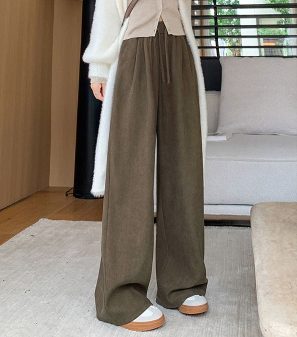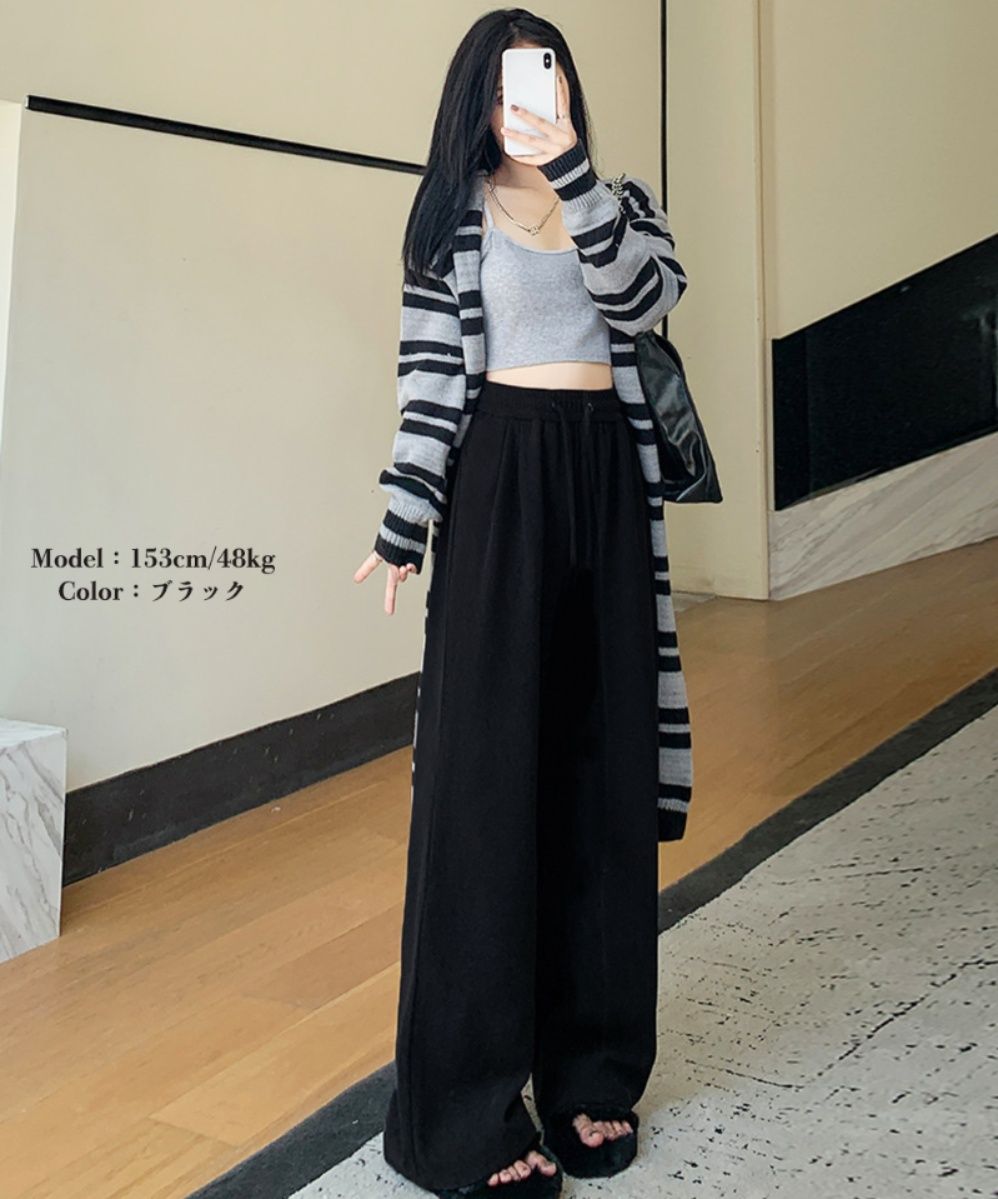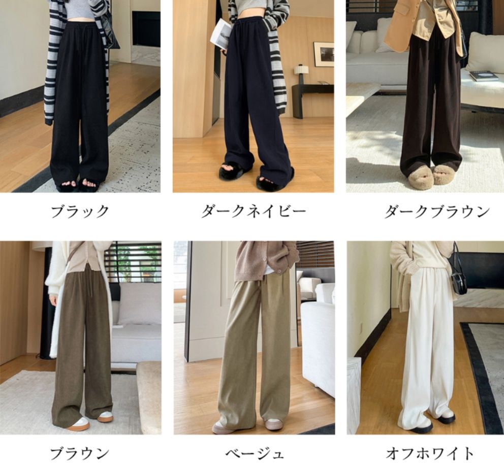 カラー:ブラック/オフホワイト/ブラウン/ダークブラウン/ベージュ/ダークネイビー サイズ:ワンサイズ(L) 着丈:約98cm 股下:約64cm ウエスト(ゴム仕様):約60-90cm ヒップ:約98cm もも周り:約56cm 裏地:なし 伸縮性:なし 透け感:なし