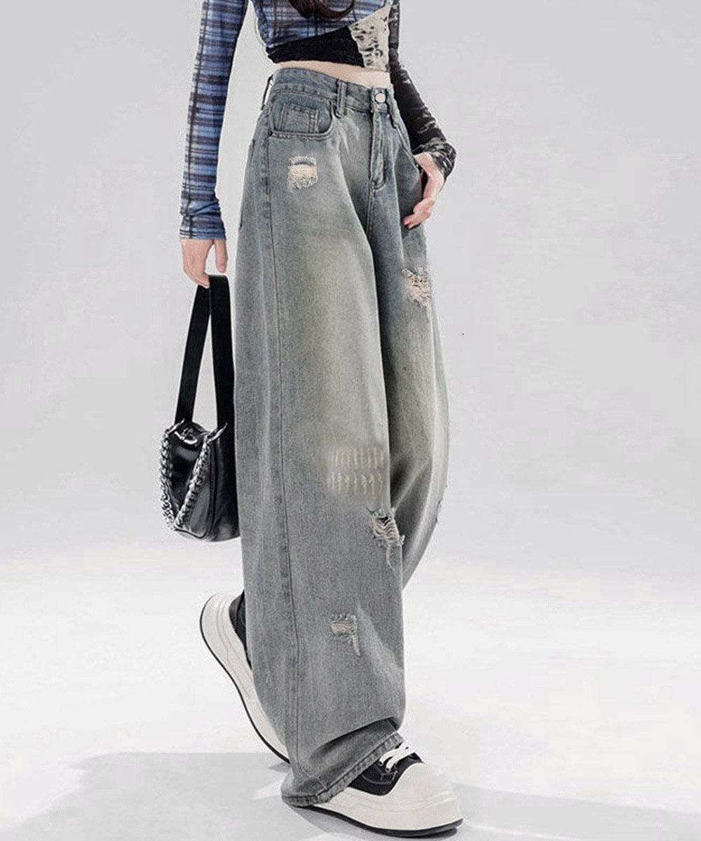 ハイウエストウォッシュ加工デニム 着やせ ストレートデニムおしゃれ カジュアルパンツ アメカジデニム ビンテージジーンズ ヴィンテージ古着風 セミワイドデニム女 体型カバーボトムス アメリカンヴィンテージテイストを取り入れた、ダメージ加工入りのレディースデニムワイドパンツ。 ハイウエスト×ストレートシルエットで脚のラインをすっきり見せ、程よいクラッシュとルーズ感がこなれた印象に。 クロップドトップスやTシャツ、スニーカーと合わせて、デイリーのお出かけからストリートシーンまで、トレンド感のあるスタイリングが楽しめる。 素材:綿95%+ポリエステル5% カラー:ライトブルー サイズ:S/M/L/XL [S]着丈:約98cm 股下:約64cm ウエスト:約64cm ヒップ:約82cm もも周り:約54cm [M]着丈:約99cm 股下:約64cm ウエスト:約68cm ヒップ:約86cm もも周り:約56cm [L]着丈:約100cm 股下:約64cm ウエスト:約72cm ヒップ:約90cm もも周り:約58cm [XL]着丈:約101cm 股下:約64cm ウエスト:約76cm ヒップ:約94cm もも周り:約60cm 裏地:なし 伸縮性:あり 透け感:なし