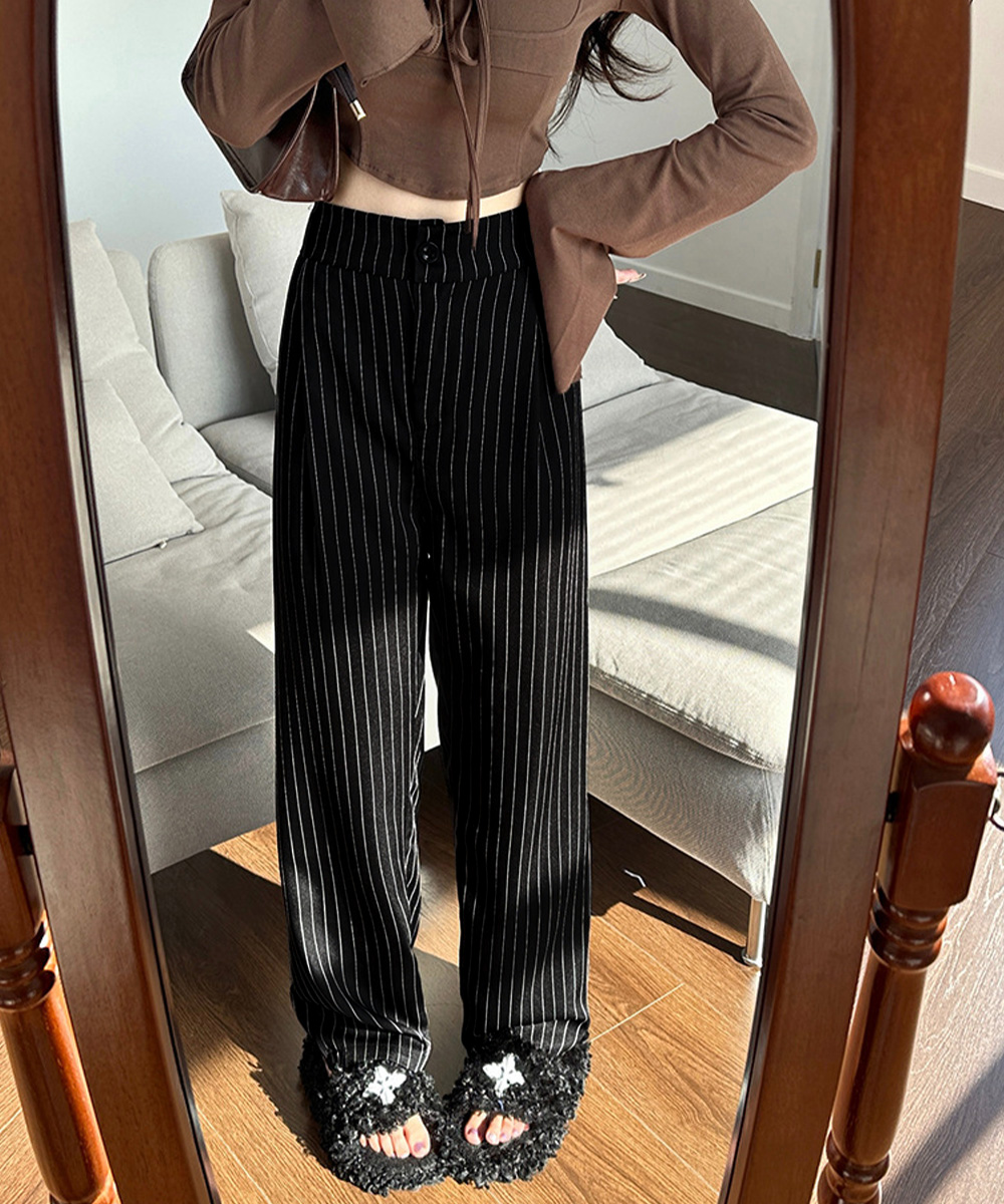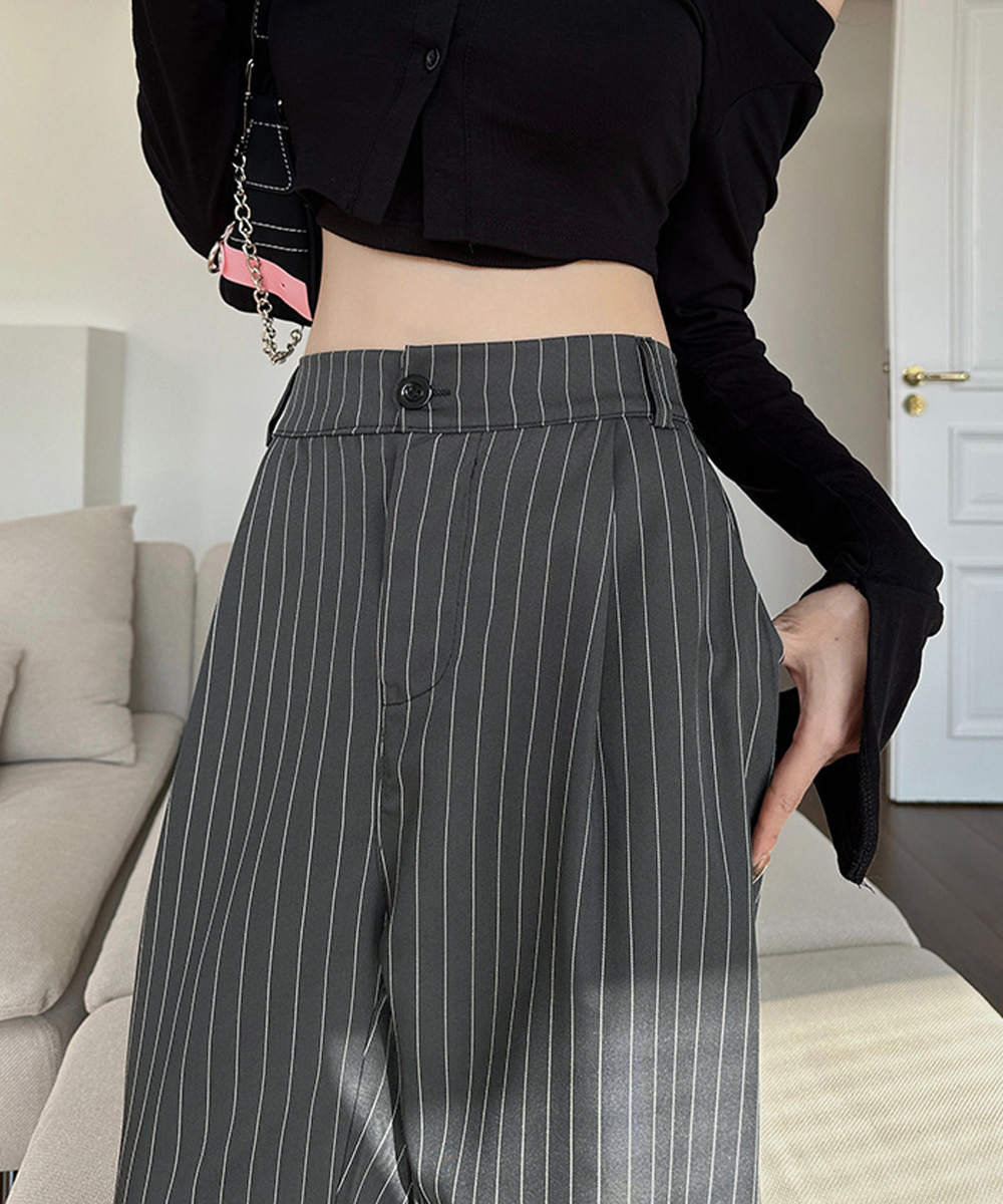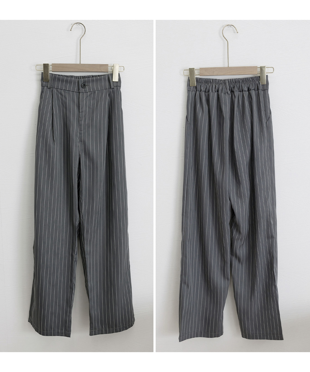 落ち感のある素材と縦のストライプラインでスタイルアップ見えするレディースワイドパンツ。