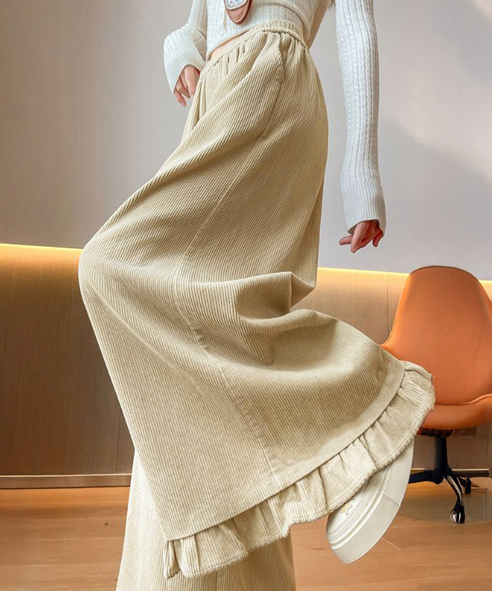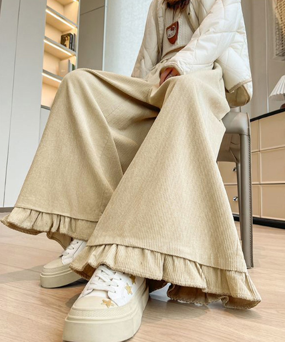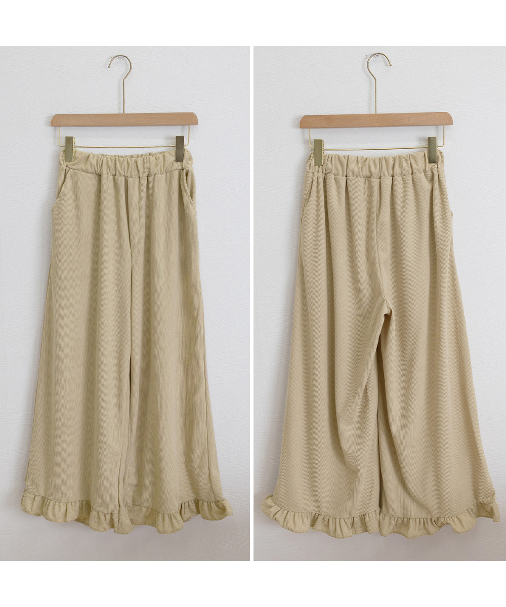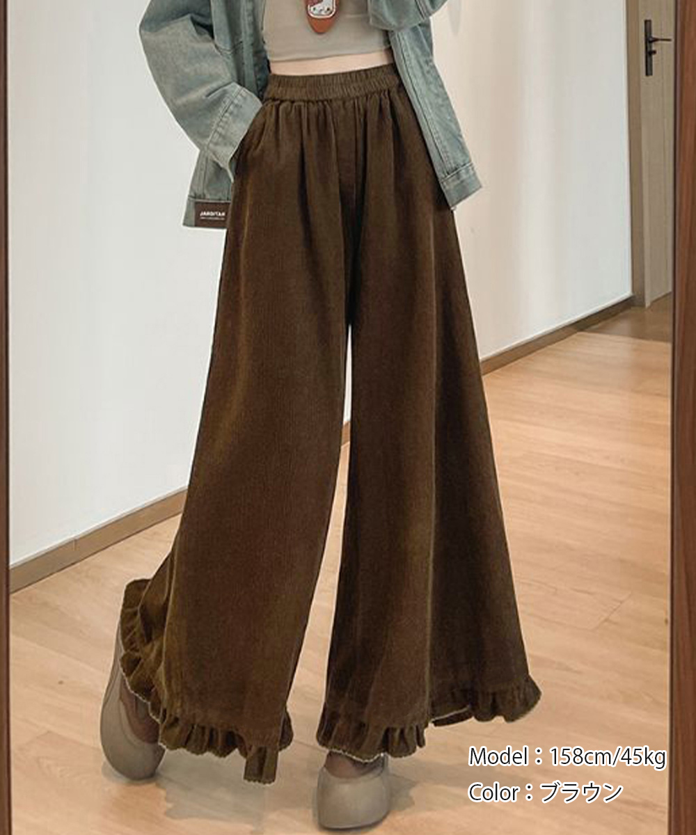 表情のある薄手コーデュロイ素材で春秋のデイリーに活躍するレディースワイドパンツ。 ハイウエストデザインで脚をすらっと見せ、スタイルよく見える。 裾のフリルデザインが動きに合わせて揺れ、女性らしさと華やかさをプラス。 ゆったりシルエットで体型を自然にカバーし、楽ちんな着心地。